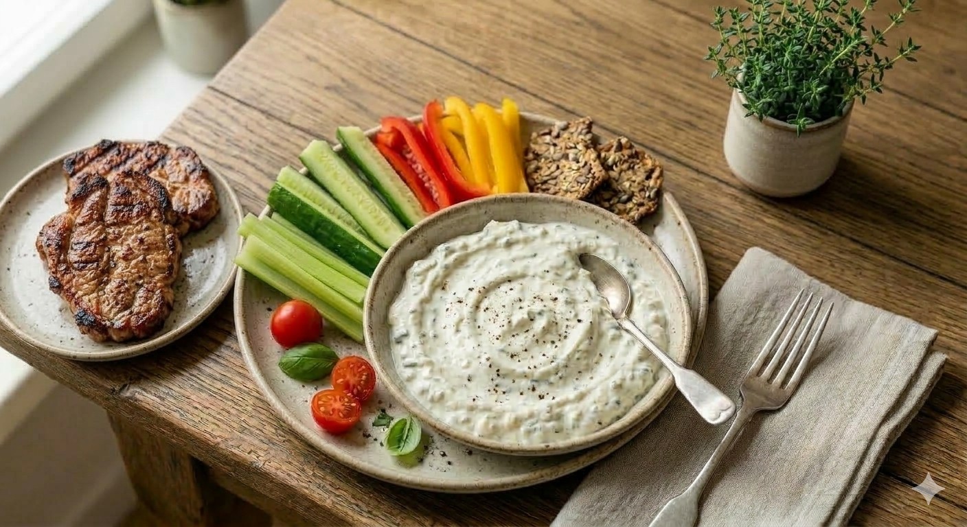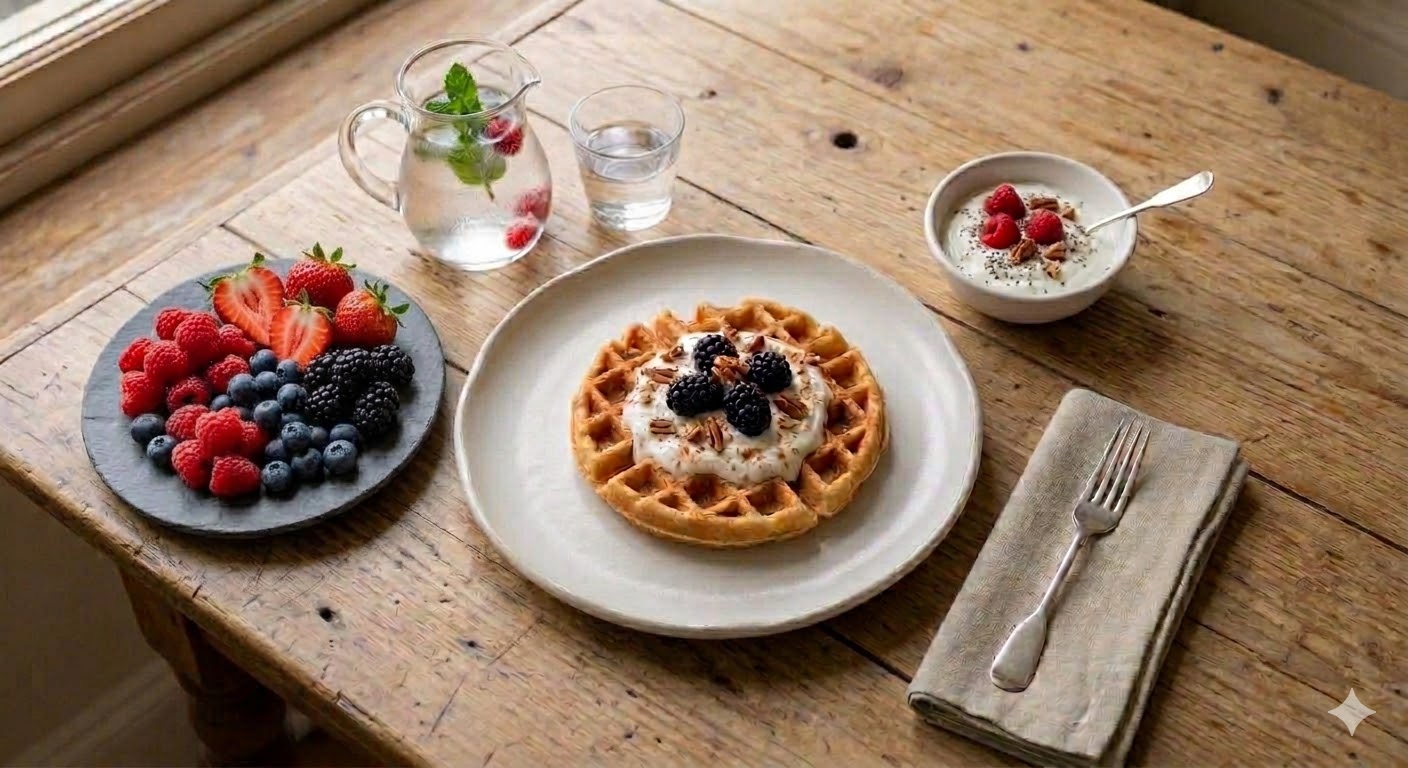 Tento recept je ideální pro rychlou a výživnou low-carb snídani. Mandlové těsto je nadýchané a syté, zatímco řecký jogurt s lesním ovocem dodá svěžest. Vše je servírováno na čistém talíři v minimalistickém stylu.