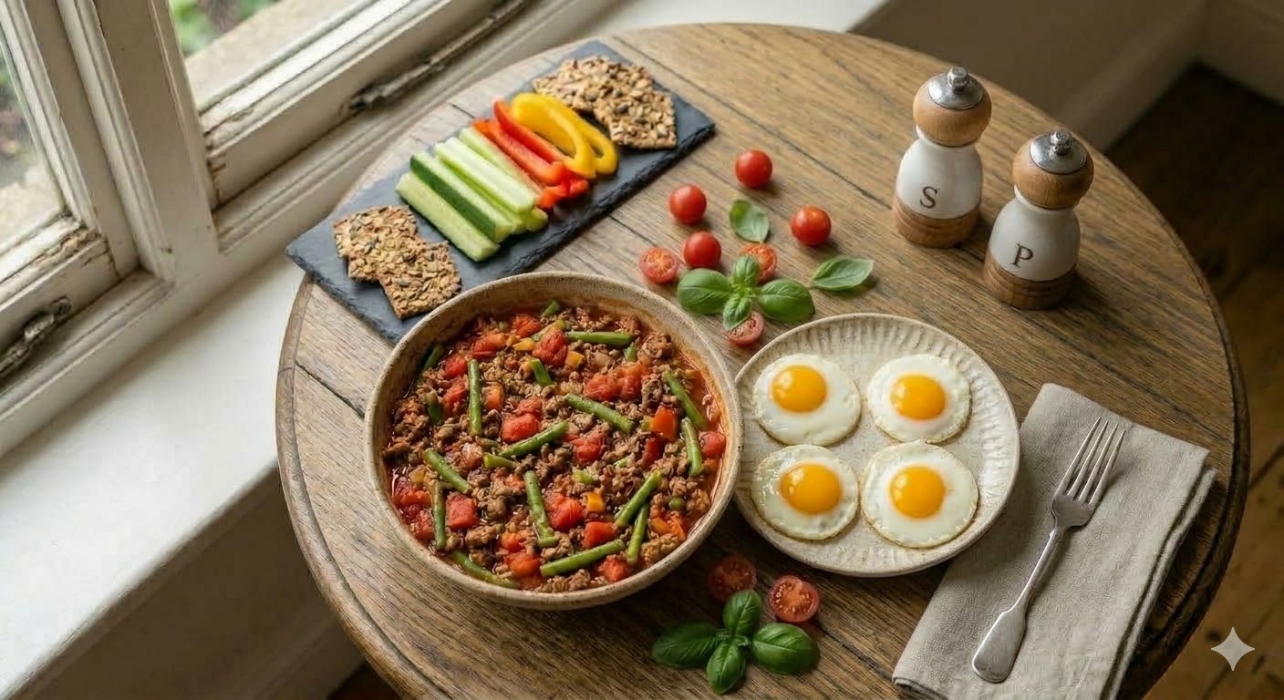 Hledáš rychlou a výživnou večeři z jedné pánve? Tahle směs mletého masa, šťavnatých rajčat a zelených fazolek je sázka na jistotu. Dokonale ji doplňují nadýchaná vejce, která díky přípravě v lívanečníku drží perfektní tvar. Ideální jídlo, které tě zasytí bez zbytečných sacharidů a dodá energii na celé dopoledne i večer.
