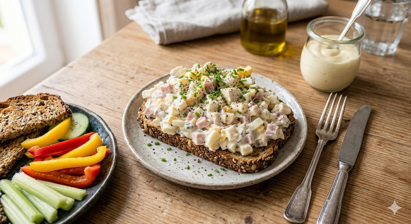 Klasika z lahůdek v poctivém domácím provedení bez zbytečných cukrů. Kombinace zralého hermelínu, kvalitní šunky a krémové majonézy na plátku low carb chleba je dokonalou volbou pro sytý oběd i rychlou večeři.