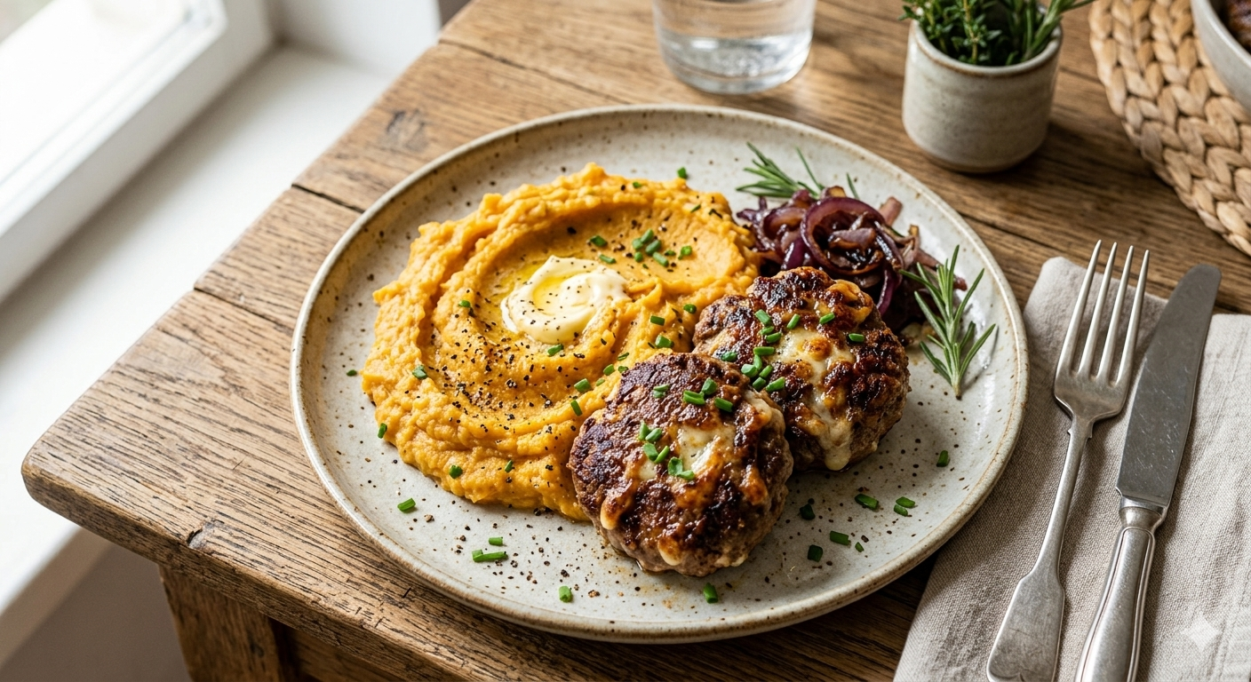 Dopřejte si poctivé jídlo, které v sobě spojuje šťavnaté mleté maso s rozplývajícím se sýrem uvnitř každého sousta. V kombinaci s jemným, přirozeně nasládlým pyré z pečených batátů a špetkou bylinek vytvoříte na talíři symfonii chutí, která vás dokonale zasytí a zahřeje. Je to ideální volba pro rodinný oběd, u kterého si budou všichni chtít přidat!